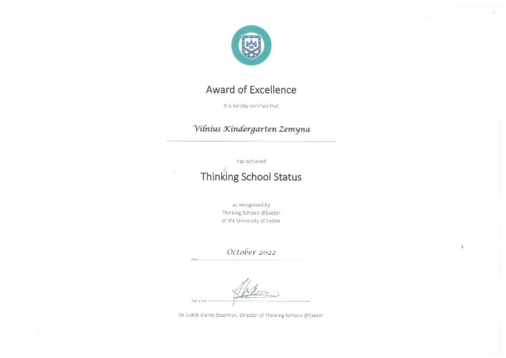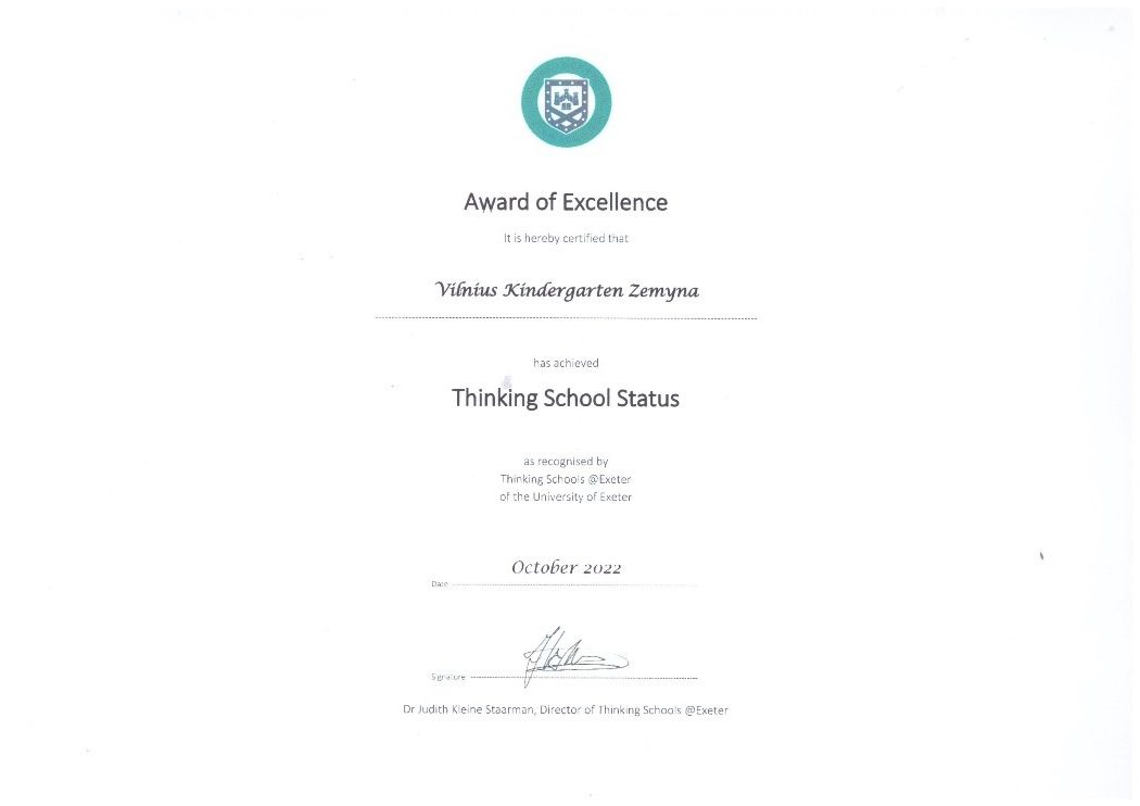 2022 m. spalio mėn. Vilniaus lopšelis-darželis „Žemyna“ Jungtinės Karalystės Exeterio universiteto vertintojų pripažintas 1 lygmens „Mąstymo mokykla“ ir jai įteiktas pripažinimą įrodantis sertifikatas. Šis sertifikatas liudija, kad įstaigoje ne tik diegiama mąstymu grįsta ugdymo kultūra, bet ir tai, kad ikimokyklinio ugdymo įstaiga atitinka nustatytus kriterijus, taikomus visų šalių akredituotoms „Mąstymo mokykloms“.